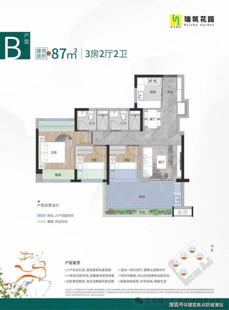 87㎡3房2卫,四开间朝南,一体化双厅设计,约6米阔绰尺度,南向四开间,约5.8米宽幕阳台。
