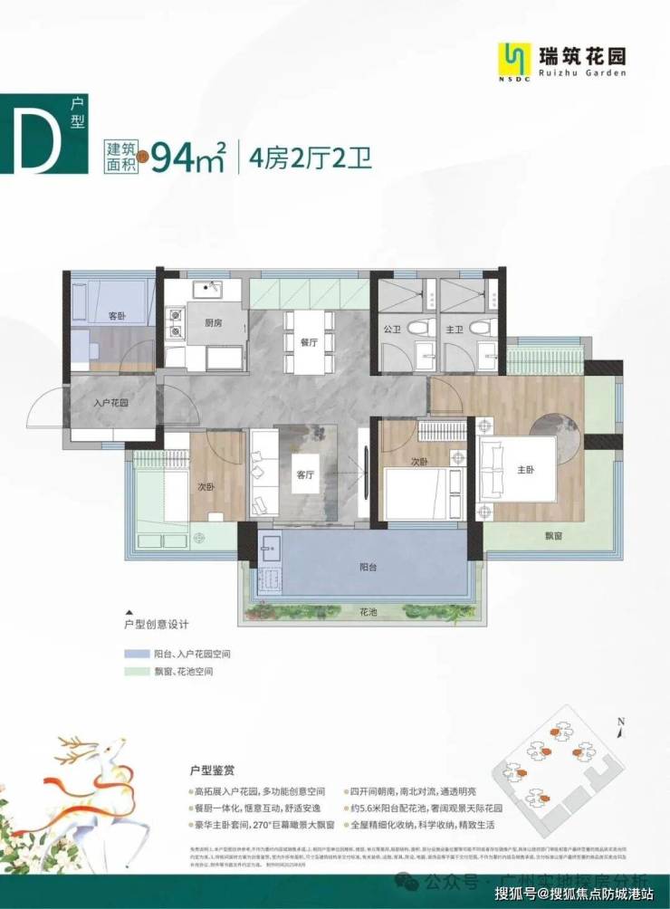 94㎡4房2厅2卫,高拓展入户花园,四开间朝南南北对流,主卧套房设计,270°瞰景飘窗。