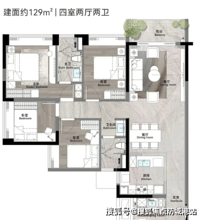 项目主要推出129平、140平和180平三种面积段的四房户型,满足不同家庭结构的需求。所有户型均采用LDK一体化设计,注重采光和通风效果。其中: