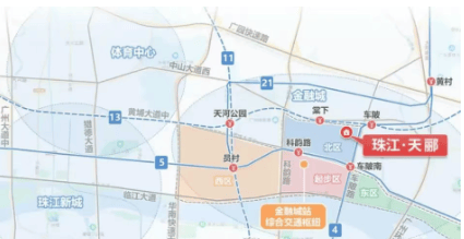 珠江天郦地处广州市天河区金融城北区,距离4号线车陂站仅600米,且临近13号线二期(预计2025年10月开通)和21号线棠东站约900米,形成三地铁交汇的便捷交通网络。自驾出行也非常便利,家门口即为中山大道,转黄埔大道即可快速到达珠江新城和琶洲等核心商务区。