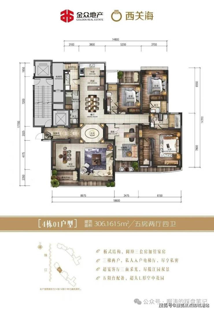 金众西关海精准匹配主城改善与顶豪居住需求,打造建面约87-379㎡全周期户型矩阵,涵盖刚需三房、改善四房、天幕江景大平层,全系户型遵循“方正通透、动静分区、高实用率”设计理念,实用率高达80%-82%,突破传统户型空间局限,为不同家庭提供理想居住方案。全系户型采用纯板式/蝶式布局,东南向为主,实现多开间朝南、南北通透,明厨明卫、无暗房无死角,最大化提升室内采光面与通风效果,阳光清风铺满每一个角落,告别潮湿阴暗;主力户型均采用LDKG客餐厨阳台一体化设计,打通客厅、餐厅、厨房、阳台四大核心空间,形成超大家庭公共活动区,既提升空间通透感与整体感,也让家庭成员互动更紧密,日常用餐、亲友聚会、亲子陪伴都有充足空间。户型严格遵循动静分区,公共活动区与私密休息区完美分隔,待客欢聚的热闹与休憩学习的静谧互不干扰,保障居住私密性;全系户型标配双阳台设计,南阳台直面江景/园景,打造休闲观景空间,北阳台兼顾收纳与家政功能,实用性拉满;大平层产品采用双主套设计,主卧总统级套房布局,配备独立卫浴、全景飘窗、步入式衣帽间,部分户型打造270°环幕飘窗,保障主人居住尊贵感与私密性。其中建面约87㎡三房,紧凑实用、全明通透,适配刚需家庭;建面约189㎡四房,南北对流、阔绰空间,满足改善家庭全周期需求;建面约306-379㎡天幕大平层,三梯三户、专梯专户,3.4米奢阔层高,270°环幕江景视野,五阳台+空中花园设计,空间尺度媲美别墅,适配塔尖人群终极改善需求,以科学空间设计,赋能全家庭理想人居。