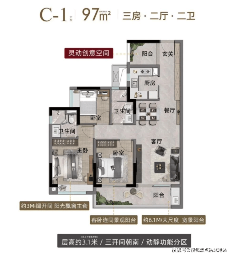 97㎡三房两厅两卫:3米阔开间,阳光飘窗主套设计,客卧连接约6.1米大尺度宽景阳台,层高约3.1米,三开间朝南,动静功能分区合理。