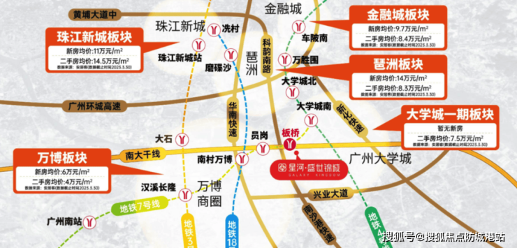星河盛世锦城坐落于万博与国际创新城之间,距离7号线板桥站仅500米,步行大约需要8分钟。项目紧邻南大干线,可通过新化快速直达琶洲、金融城和珠江新城等核心区域。此外,计划中的金新大道至大学城过江隧道将使自驾前往大学城更加便捷。