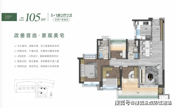 105-143㎡改善四房:更大尺度客厅、主卧套房、南北通透设计,兼顾舒适性与功能性。