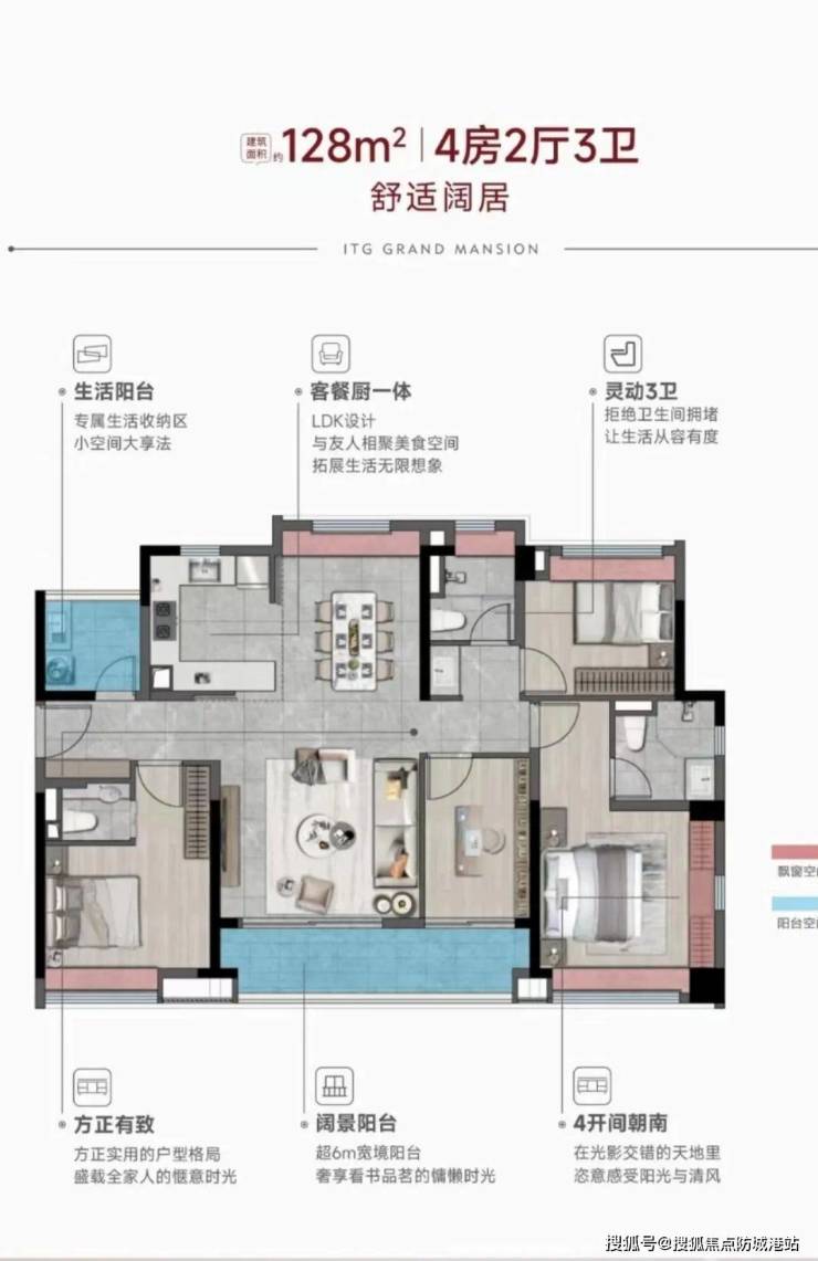 128㎡四房两厅三卫:四开间朝南,空间阔绰,每个房间都宽敞明亮,提供舒适的居住体验。
