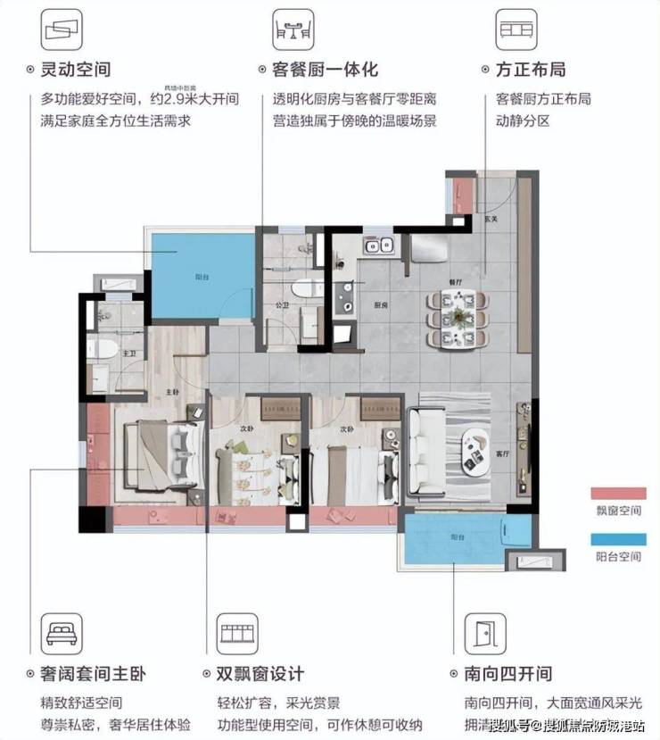 所有户型采用LDK餐厨一体设计(建面约84㎡-103㎡),实用率高达约85%,将客厅(Living room)、餐厅(Dining room)和厨房(Kitchen)进行一体化设计,创造出自由开合的大生活空间。