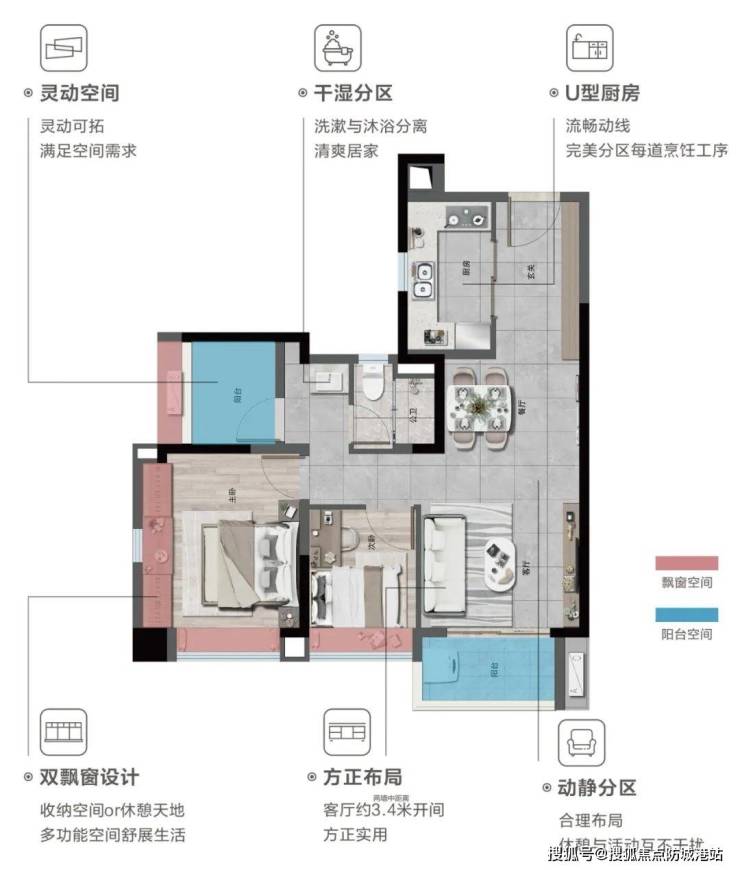 76㎡两房两厅一厨一卫+1灵动空间:适合年轻夫妇或小型家庭,空间利用率高,功能分区合理。