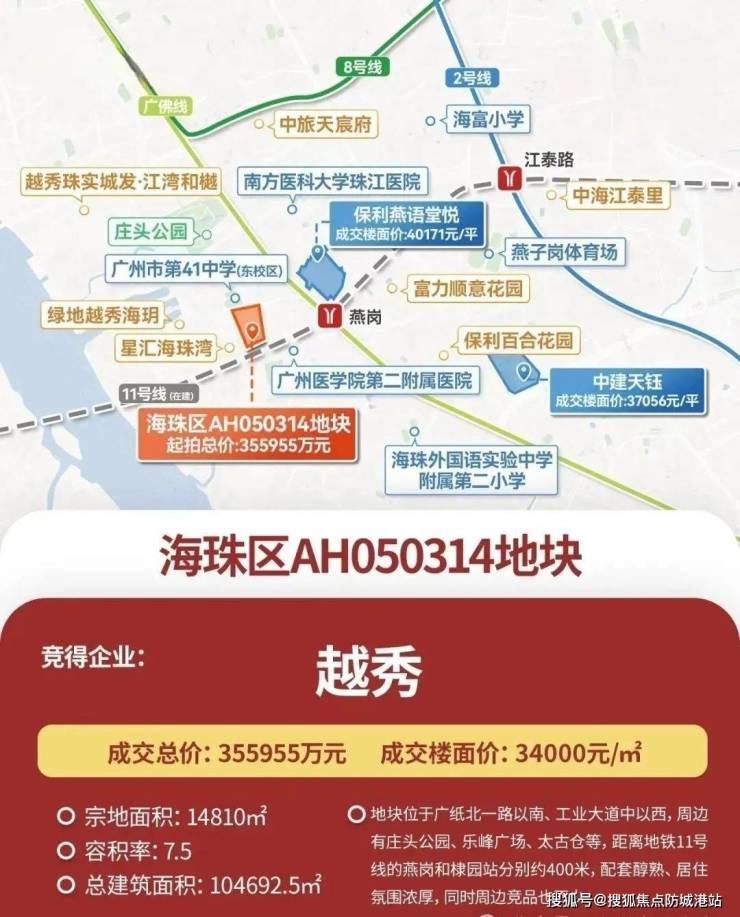 越秀地产在2025年9月19日以总价35.6亿元、楼面价3.4万元/平方米的价格成功竞得广纸314地块。该项目占地面积约14810平方米,总建筑面积约为104693平方米,规划为一个小型社区,共建设4栋住宅楼,提供约1040户住房。作为海珠区重点开发的广纸板块的一部分,熙悦江湾不仅继承了区域成熟的商业和生活配套设施,更凭借其独特的设计与高端配置成为市场焦点。