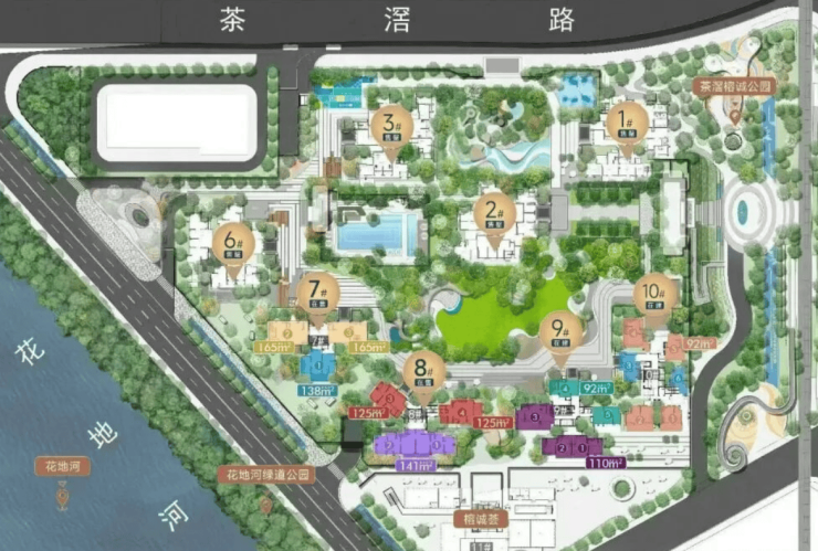* **建面约98㎡ 经典三房两厅两卫**:创新性实现 **“四开间朝南”** 格局,南向面宽约 **10.8米**,采光日照极为充沛。连接客厅的 **约6.2米宽景阳台**,不仅可俯瞰社区中央园林,更将远处花地河生态景观引入室内,视野开阔。