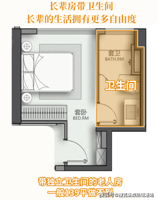 带卫生间的长辈房:139m²户型即可实现,增加长辈生活的自由度。