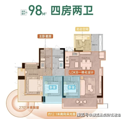98㎡四房两卫:总价210万起,四开间朝南,阳台宽度约5.6米。