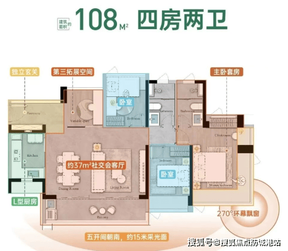 108㎡五房两卫:总价240万起,五开间朝南,客厅开间达6.3米。