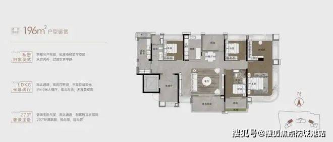 户型设计:采用2T3、2T2设计,提供了宽敞的空间布局。例如,建面约196平米的户型拥有近7米宽的大横厅设计,LDKG一体化设计使餐客厨空间接近60平米,增强了空间的通透感和采光效果。