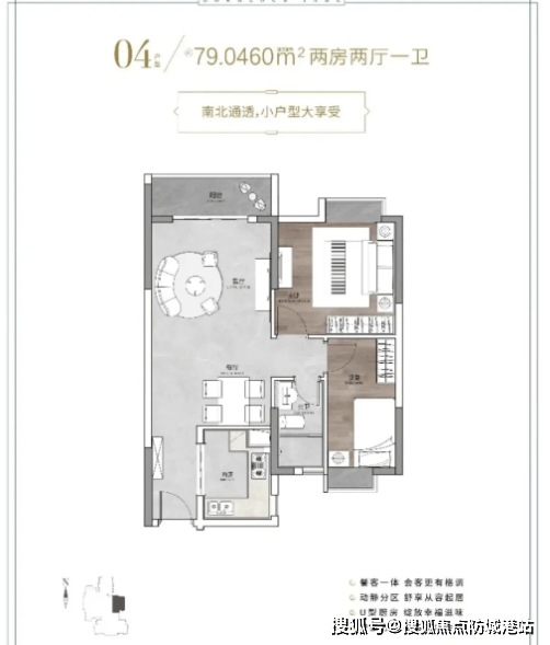建面约79㎡两房户型,布局方正合理,空间利用率高,动静分区明确。客厅连接观景阳台,保证室内采光与通风效果,让空间更显通透;主卧与次卧朝南设计,阳光充足,居住舒适;厨房采用L型布局,操作空间充足,动线合理,方便日常烹饪;卫生间干湿分离,保持室内干燥整洁,适合刚需小两口或三口之家居住。