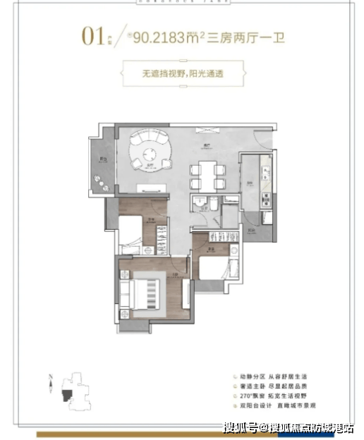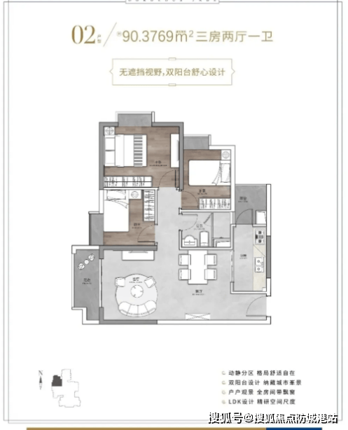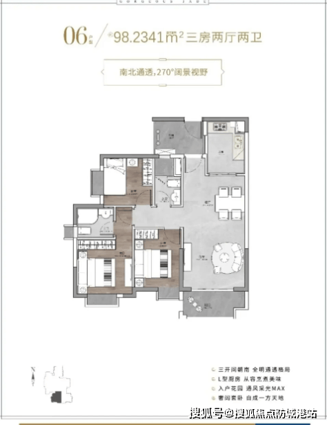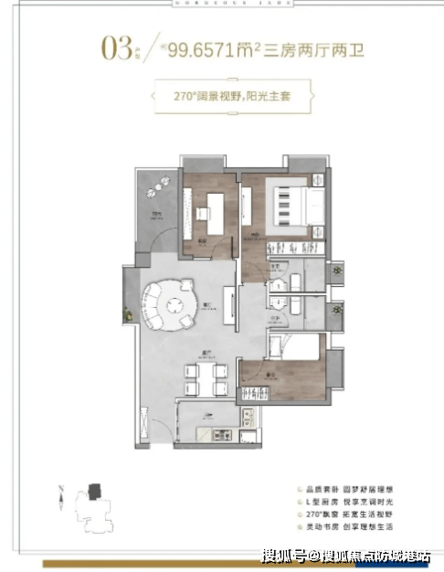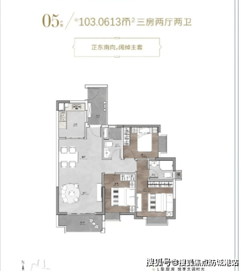 建面约103㎡三房户型,作为项目的改善型户型,空间尺度更佳,居住体验升级。户型南北通透,采光通风效果极佳;客厅与主卧空间开阔,搭配大尺寸观景窗,可俯瞰社区绿意与周边景致;厨房配备独立储物空间,收纳能力更强;三个卧室空间均较为宽敞,能满足多人口家庭的居住需求,同时预留充足的活动空间,适合追求品质生活的改善型家庭。