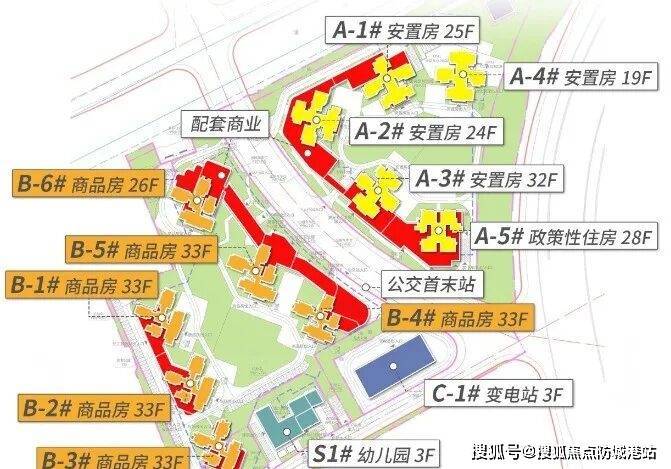 社区由 6 栋 26-33 层的商品房组成,采用2 梯 5 户的设计,总户数 889 户,体量适中,既不会因为社区过大导致管理不便,也不会因为体量太小缺乏生活氛围。社区以中间规划路为界,左侧是商品房区域,右侧为安置房和公租房区域,分区明确,保障商品房业主的居住体验。此外,项目还配建了 1 所 9 班幼儿园、托儿所和公交首末站,满足业主日常的基础生活需求。