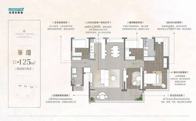 产品优势:央企龙湖开发,精装交付配备中央空调、新风系统、智能安防,选用西门子、科勒等国际品牌,95㎡户型得房率83%,139㎡户型得房率130%,LDKG一体化方厅达59㎡。