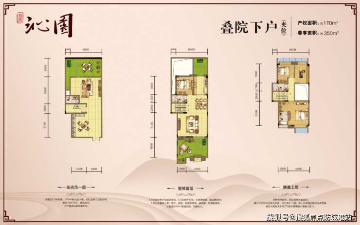 飞晟·沁园推出了多种户型以满足不同家庭的需求,其中双拼产权面积为313平方米,包括6房3厅,室内室外活动空间宽敞;上叠院产权面积则有170平方米和223平方米两种选择,每户均赠送室内采光天井,并配备了超大的多功能空中花园。