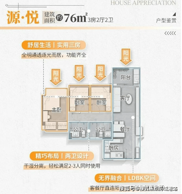 76㎡三房两厅两卫:紧凑实用,三开间朝南,主卧带飘窗,双卫设计提升居住私密性,适合三口之家或首次置业者。