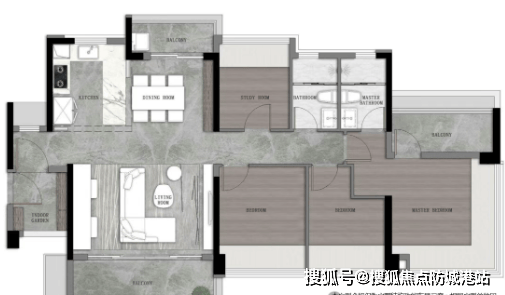 103㎡四房两卫:适合三代同堂的家庭,五开间约14米采光,开放式厨房,270°无立柱转角阳台。