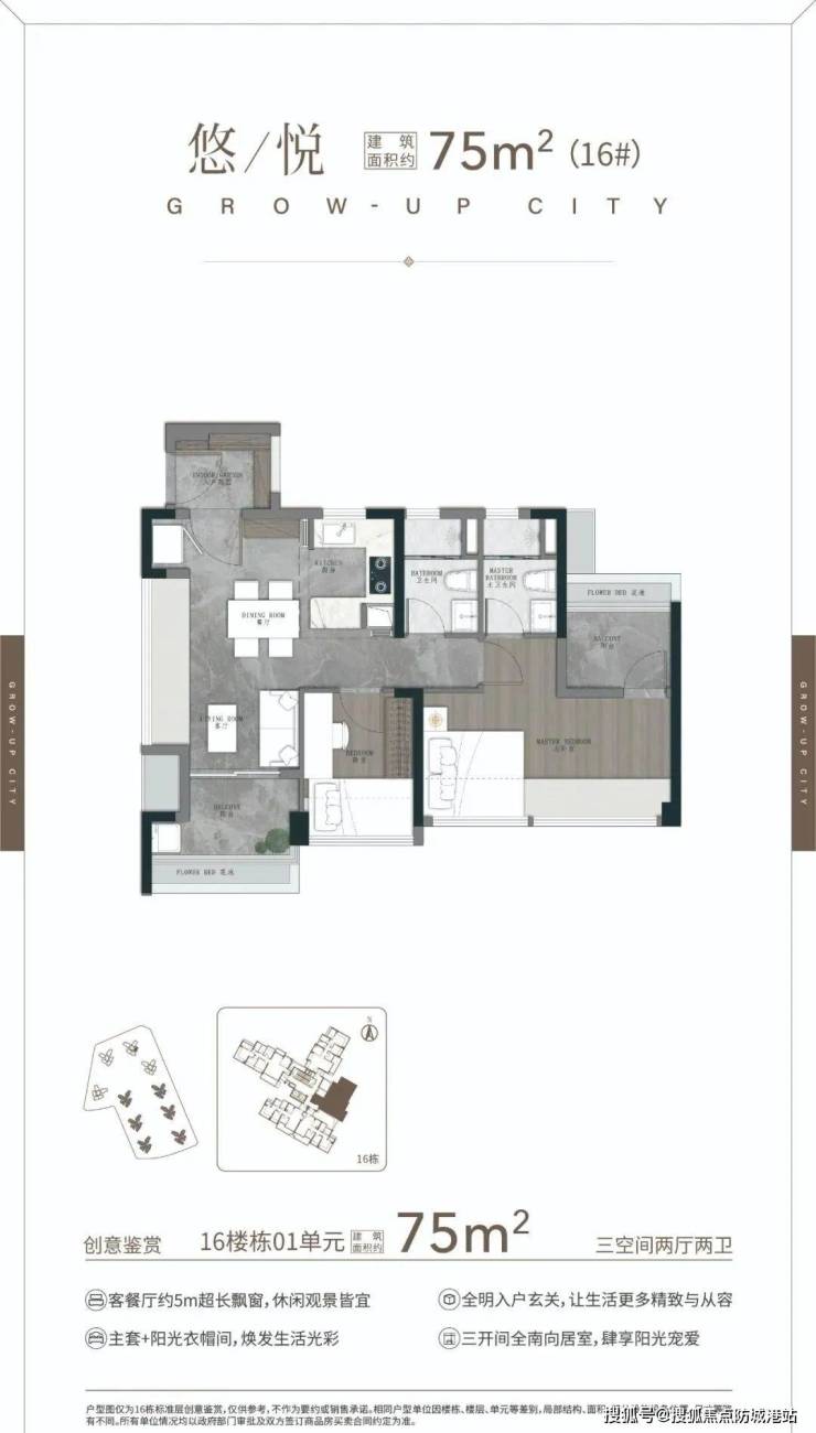 75㎡三房两卫:四开间朝南,开放式厨房,开阔景观阳台,南北对流主套及衣帽间。
