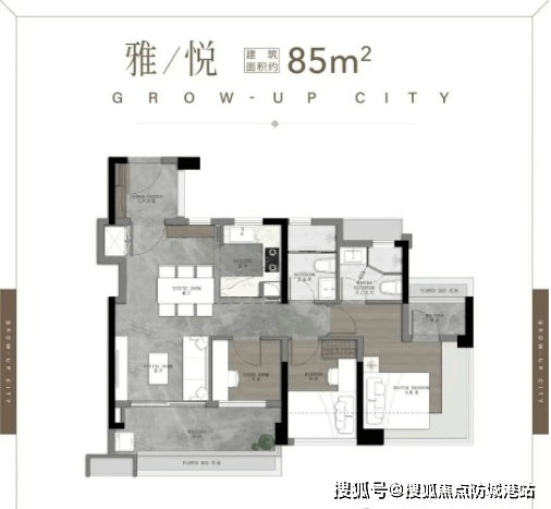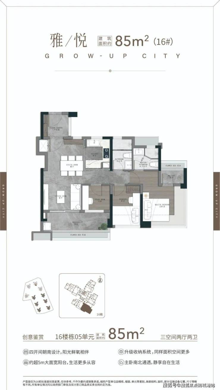 86㎡三房两卫:三口之家的理想选择,南向四开间,约11.1米采光,双进私密玄关,5.4米跑道式阳台。