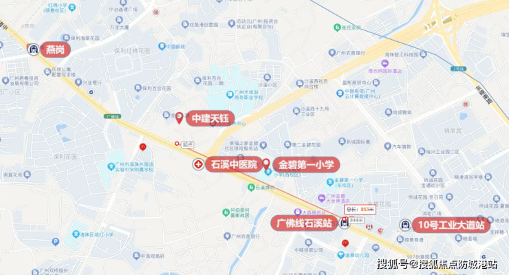 中建天钰占据海珠西核心区位,地处工业大道与新滘西路交汇处周边,紧邻珠江后航道经济带,同时享受广佛融合示范区的发展红利,地理位置得天独厚。项目与保利燕语堂悦直线距离仅1.4公里,共享区域成熟配套,同时凭借更优的地铁通勤优势,形成差异化竞争力。