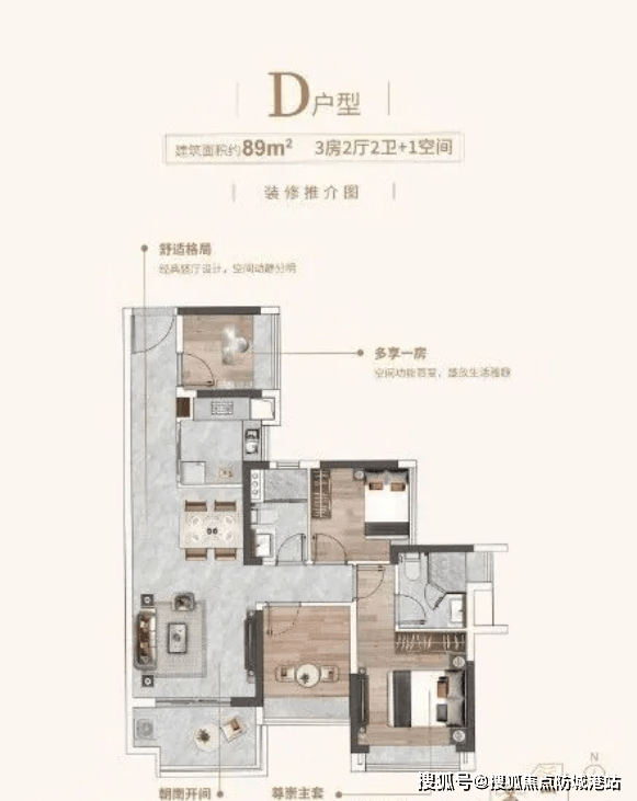 89㎡:三房两厅两卫+1空间,经典竖厅设计,动静分区明确。