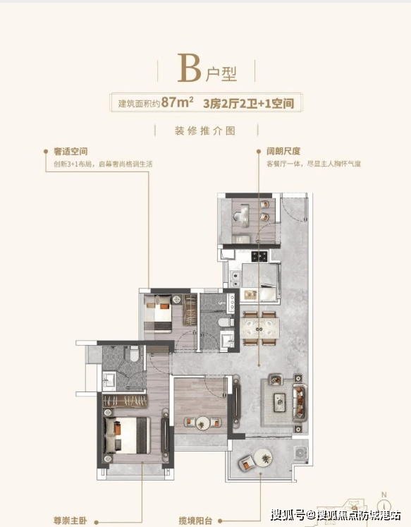 87㎡:三房两厅两卫+1空间,餐客一体设计,主卧套房布局。