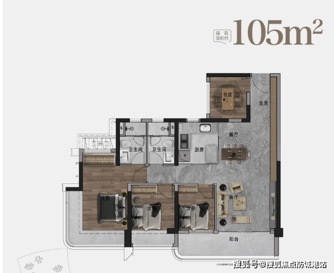 约105㎡ 三房两厅两卫/四房两厅两卫:主力王牌户型,拥有南向、东南向等多朝向选择。南向户型拥有约6.8米宽阔景阳台,连接客厅与次卧,视野开阔。部分户型可灵活改造为“3+1”房,满足书房或多功能室需求。主卧套房设计,配备独立卫浴,私密性强。