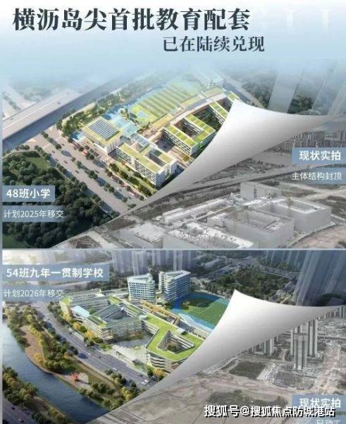 学校规划:横沥岛上规划有小学3所、九年制学校3所、十二年制学校1所及国际学校1所。其中,一所54班九年制学校将于2026年投入使用,另一所48班小学将于2025年投入使用。