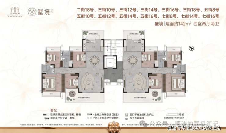 墅境组团为全新规划新规改善产品,空间营造标准远超常规住宅指标,整体标准层高3.15 米,首层专属层高达到 3.3 米,室内纵向空间宽裕,采光通风效果全面优化。组团全系户型使用率突破 100%,空间拓展性能优异,无室内面积浪费。主力建面约 142㎡南向四室两厅两卫户型,采用 LDKG 一体化大通厅布局,公区整体面积约 69 平方米,空间开阔尺度优越。户型户户南北通透,标配双阳台系统,约 8 米南向观景阳台搭配 4 米北向生活阳台,形成 270 度环幕观景视野。主卧配置约 3.7 米超长全景飘窗,最大化引入自然阳光与清风,室内创新设计约 3.8㎡过道隐藏式空中储物柜,搭载一键升降存取系统,拓展居家收纳空间,革新传统住宅空间利用模式。