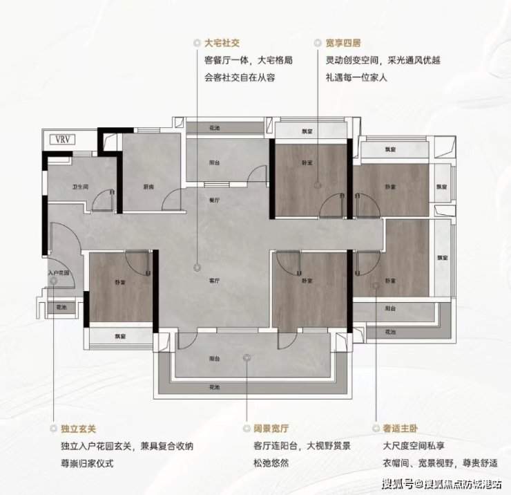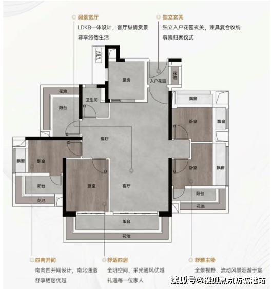 建面102㎡飞机户型四房两厅两卫:经典飞机户型设计,南向朝阳面宽阔,景观视野极佳。采用LDKB一体化设计,将客厅、餐厅、厨房、阳台融为一体,打造开阔会客空间,适合家庭聚会与宴请宾客。户型外围环绕花池与飘窗,赠送面积高,空间实用性拉满,每间卧室布局合理,互不干扰,保障居住私密性。