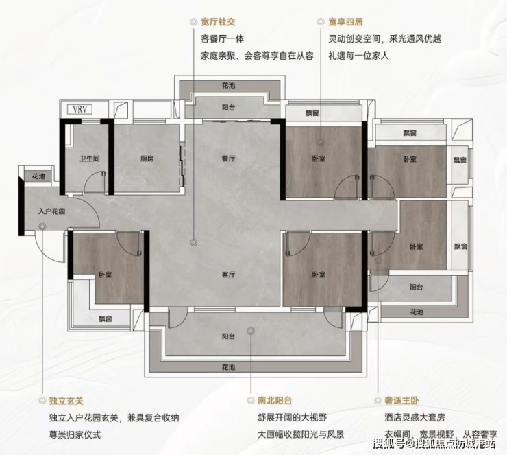 建面115㎡南北对流四房两厅两卫:主打南北对流设计,四开间朝南,通风采光俱佳。南面宽阳台搭配花池赠送,空间阔绰,可作为休闲阳台或晾晒区;北面餐厅衔接花池,可改造为餐边柜,增加收纳的同时强化空气对流。主卧L型花池设计,景观面大且不占用室内空间,实用性与观赏性兼具,适合改善型家庭。