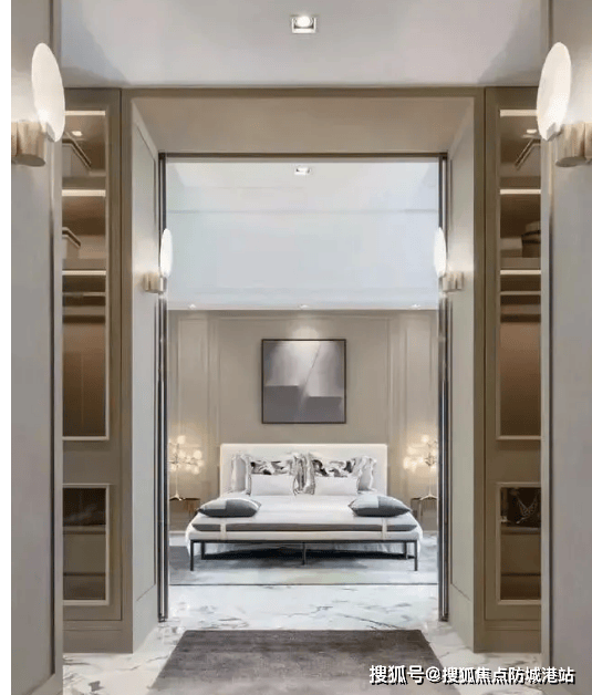 该户型采用向心围合布局,经过精准角度扭转,确保无遮挡视野,推窗即可俯瞰南湖与白云山景观。室内采用法式浪漫设计风格,打造“水晶玻璃盒”式空间,客厅、餐厅、主卧、次卧等主要空间均配备两面以上采光,负一层引入采光天井,让阳光与清风贯穿全屋,记录“光的行走印记”。主卧设计极具仪式感,进门两侧配备超大步入式衣帽间,廊道铺设星光红毯,尽头为睡眠区,搭配落地玻璃窗与简洁天花,营造出自然流畅的空间质感。