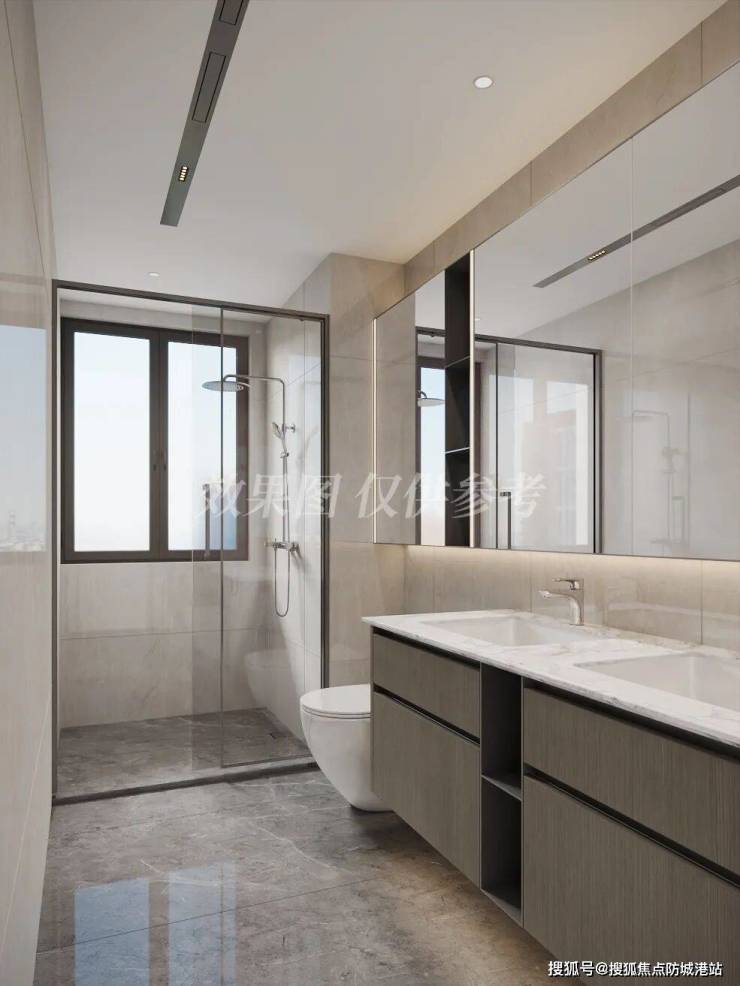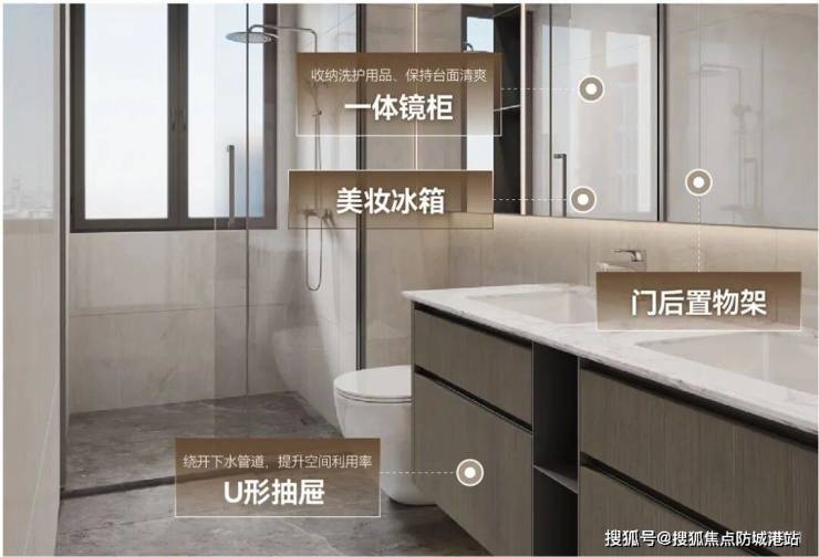 卫浴采用U形台盆抽屉及一体防雾镜柜,主卧镜柜升级加配门后置物架、美妆冰箱等。敞亮不杂乱,分分钟住出超级爽感!