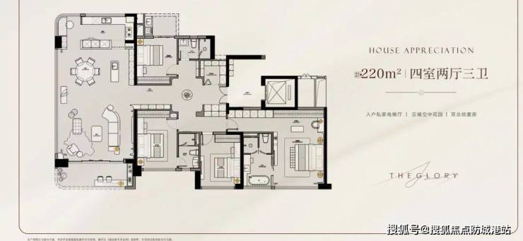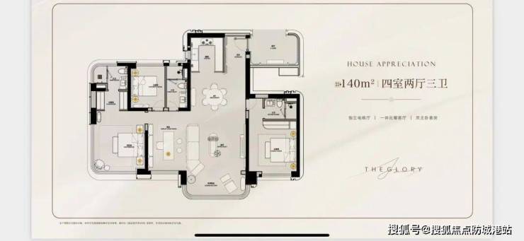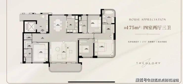 项目外立面以香槟金铝板与晶钻叠层玻璃构筑“珠江之镜”,并以零涂料外立面刷新城市颜值上限。园林方面,330米中轴园林贯通南北双园,设计上以“礼序对仗”为核心,将中国传统建筑美学与现代都市生活完美融合,打造了一条充满仪式感的归家动线。