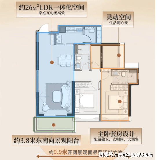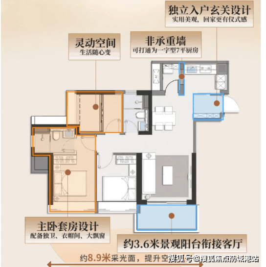 87㎡小户型采用“麻雀虽小,五脏俱全”的设计理念,在有限的空间内实现功能最大化,同时相比市面同面积段产品更具优势。户型采用少承重墙化设计,空间灵活性极高,次卧可根据家庭需求自由打通或隔开,满足不同阶段的居住需求;生活阳台可与厨房打通,拓展出7㎡的全明空间,增加使用面积与采光通风效果。