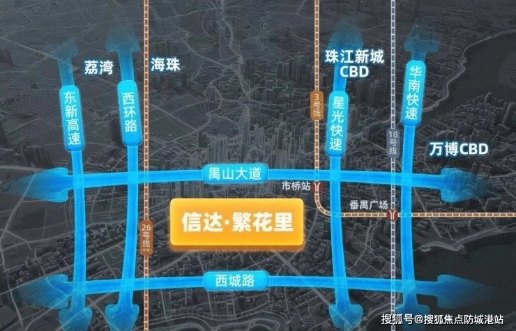 周边有禺山大道、西环路,通达全城,接驳东新高速快速畅达荔湾海珠,也可接驳新光快速畅达万博CBD、珠江新城CBD,自驾出行方便