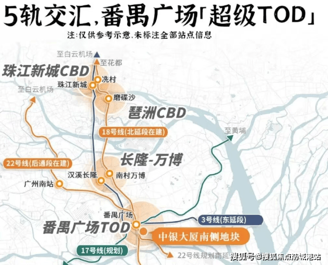 项目紧邻番禺广场地铁站E出口,这里是18号线、22号线、3号线、3号线东延段、17号线(规划中)的交汇站,极大地提升了通勤的便捷性。尤其是18号线和22号线,时速高达160公里/小时,能够快速连接到万博、海珠琶洲、天河东站等地。