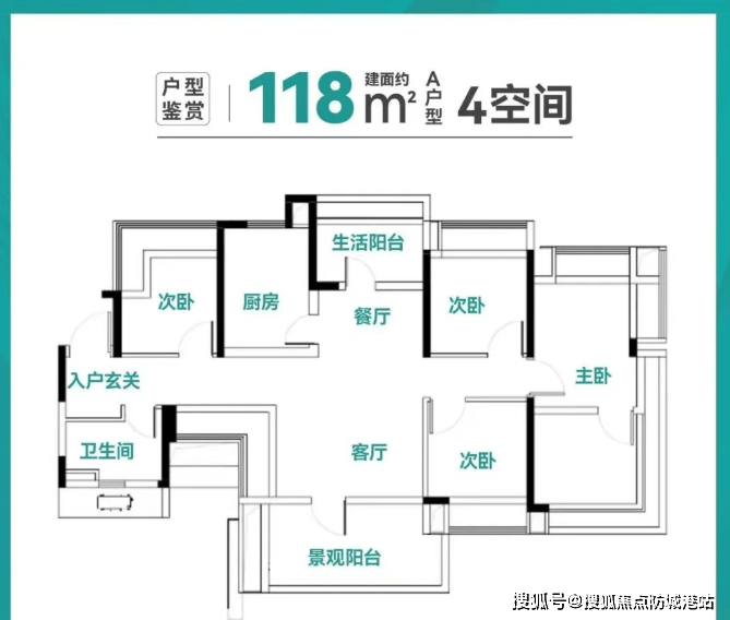 118㎡A户型:四开间朝南,约16.3米南向面宽;南北对流双阳台,独立家政空间。