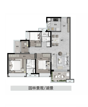 2. 92㎡三房二卫户型:采用三进式设计,有效提高全屋实用率,避免空间浪费。户型为单边位,实现南北对流,采光通风效果极佳;配备270°环幕景观阳台,视野开阔,可同时观赏园林与部分湖景,为业主带来沉浸式景观体验,满足改善型家庭对居住品质的需求。