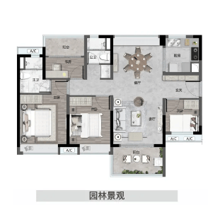 7. 140㎡四房三卫户型:项目高端户型代表,采用标准双厅设计与南北对流格局,搭配6米南向阳台与270°环幕阳台,全景俯瞰白云湖生态景观,视野极致开阔。双主套豪华配置是该户型的核心优势,两个主卧均配备独立卫生间与衣帽间,保障家庭成员的隐私与舒适,适合追求高品质生活的改善型家庭或高净值人群。