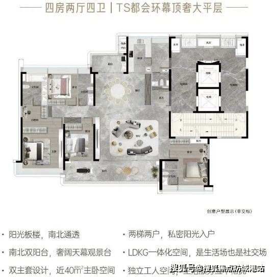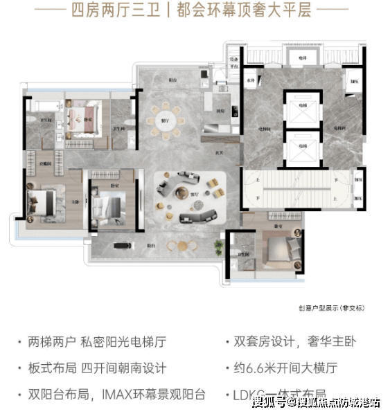 双阳台设计,约10.3米宽巨幕阳台,双主卧套房,总统级主卧奢套。