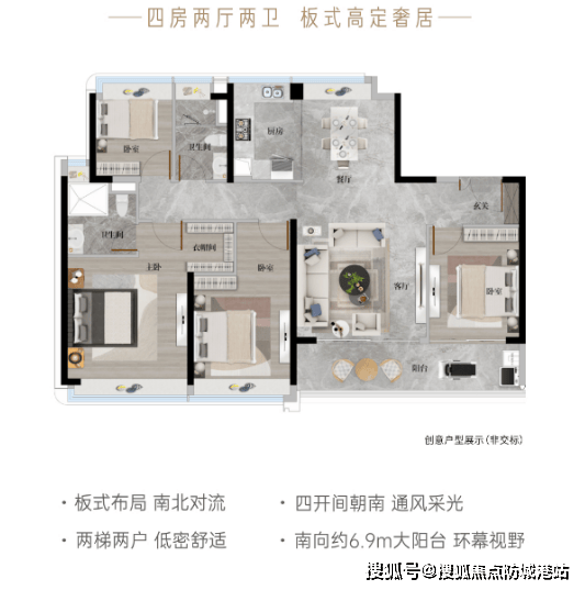 双阳台设计,近9米宽巨幕阳台,双主卧套房,总统级主卧奢套。