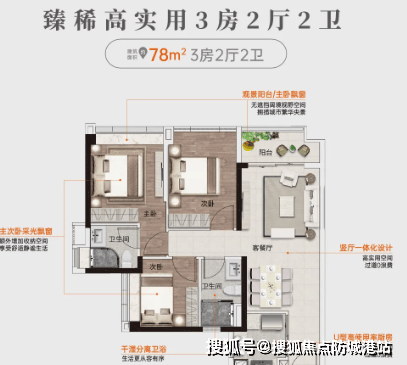 建面约78平方米 3房2厅2卫:无遮挡阔境视野空间,高实用空间,过道0浪费,额外增加收纳空间。