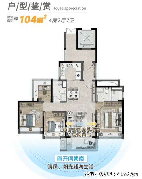 一百零四平方米的四房两厅两卫户型,是刚需改善的热门之选。总价三百九十五万起,四开间朝南设计,采光通风俱佳。自带的入户花园,可灵活改造成书房或儿童房,增加了空间的实用性。主卧独立套房带飘窗,卫生间干湿分离,使用率约百分之八十二,完美满足三口之家或二胎家庭的基础居住需求。这样的户型,既保证了居住的舒适性,又兼顾了经济性,是许多年轻家庭的理想选择。