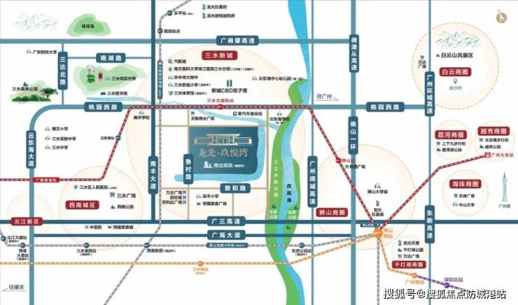 城轨:距广佛肇城轨三水北站直线约700米,2站直达广州越秀或广州南站,7站直达深圳机场站。