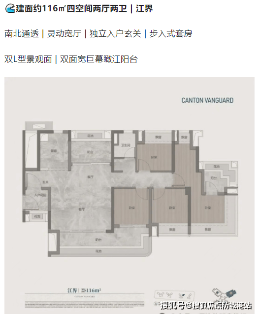 135平方米户型升级为通透四开间朝南,拥有一体化瞰江宽厅。