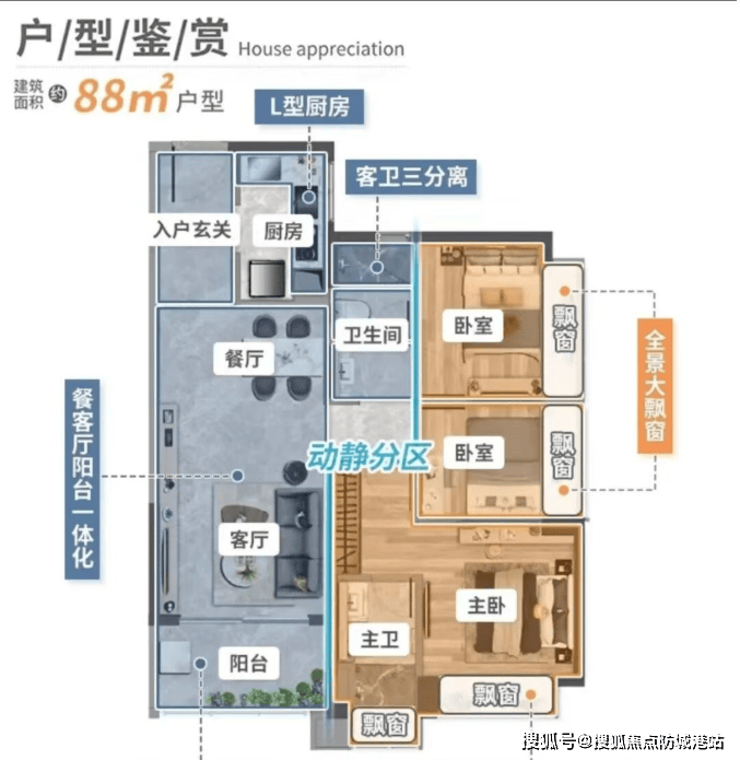 户型设计合理:从80平方米的三房到106平方米的四房,满足不同家庭需求,采光通风良好,居住舒适度高。
